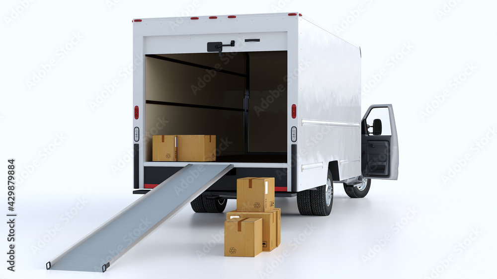 Parcel Van With Open Doors And Lowered Ramp With Cardboard Boxes On Isolated Background Delivery And Shipping Concept 3d Render Stock Illustration Adobe Stock